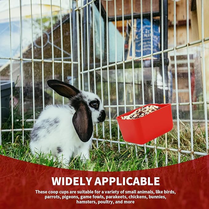 - 【High Quality】The material of the chicken cage feeding cup is high quality plastic, odorless, wear-resistant and sturdy.The edges of the chicken feeding and watering bowl are smooth and very safe for your birds, poultry, rabbits, chickens and small animals, you can use it with confidence.Bright colors can also attract pets' attention and enhance their appetite.