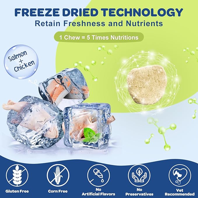 - Treat with Delicious Flavor: Freeze-dried salmon skin treats for dogs, made with real chicken & salmon-perfect for picky eaters. Unlike pills or capsules, dog care chews offer bite-size convenience—making feeding as simple as giving treats