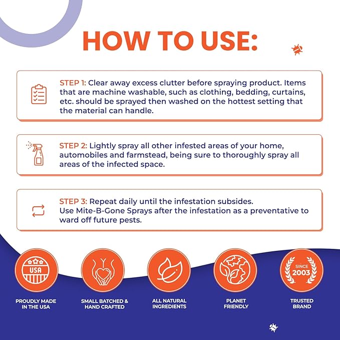 - MIGHTY MITE SLAYER: Our Mite-B-Gone Mite Killer Spray is a potent mite eliminator designed to wipe out all common household mites, from human mites to dust mites, bird mites, rat mites, carpet mites, and more. It also swiftly eradicates indoor and outdoor bugs, spiders, and ants within 2 minutes of contact, ensuring your home remains pest-free. Our product is proudly listed on the EPA's 25(b) for using the least harmful natural ingredients.