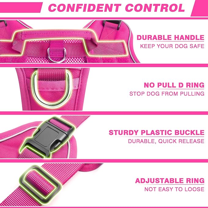 - 【4x Plastic Buckles + 2 D-rings】: Put on and take off this easy dog harness with 4 quick-release buckles from the side of the dog’s neck instead of the headwith no hassle. We also have adopted a widened design for the large dog. 2 stainless steel D-rings at the front chest and back for training, short and long leashes. This dog harness is made with military grade materials and reinforced stitching.
