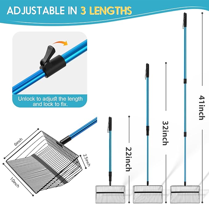 - Detachable Long Handle: This chicken poop scooper can be adjust from 22" to 41", offers unparalleled reach and convenience. And the detachable design allows for easy storage, fitting effortlessly into your cleaning routine.
