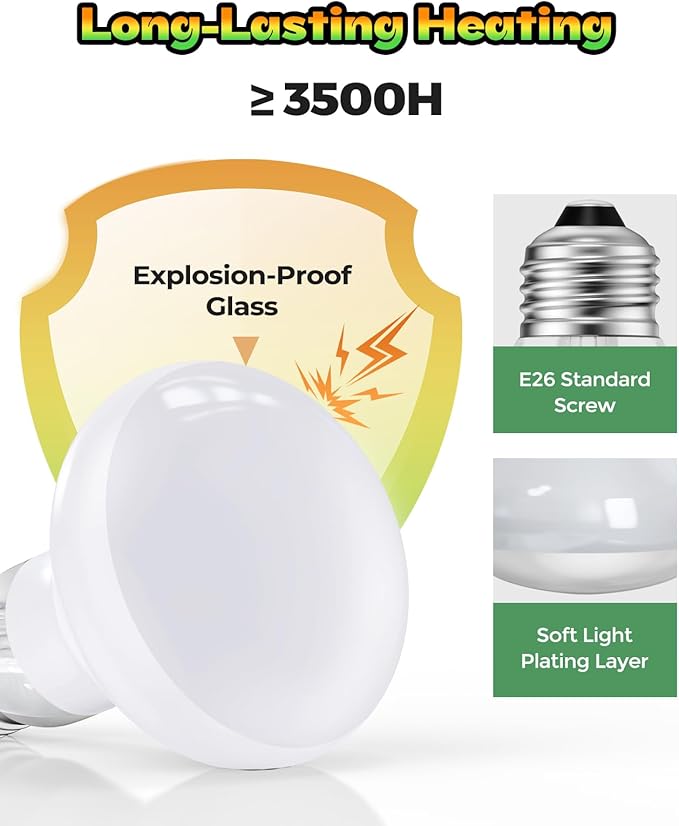 - Premium Reptile Heat Lamp: Our basking light is crafted from high-quality glass and filament materials, ensuring safe and reliable use. Designed for durability, this heat lamp delivers consistent performance with a lifespan of up to 3,500 hours. Plus, each reptile light bulb undergoes rigorous inspections and safety certifications, guaranteeing top-notch quality and safety