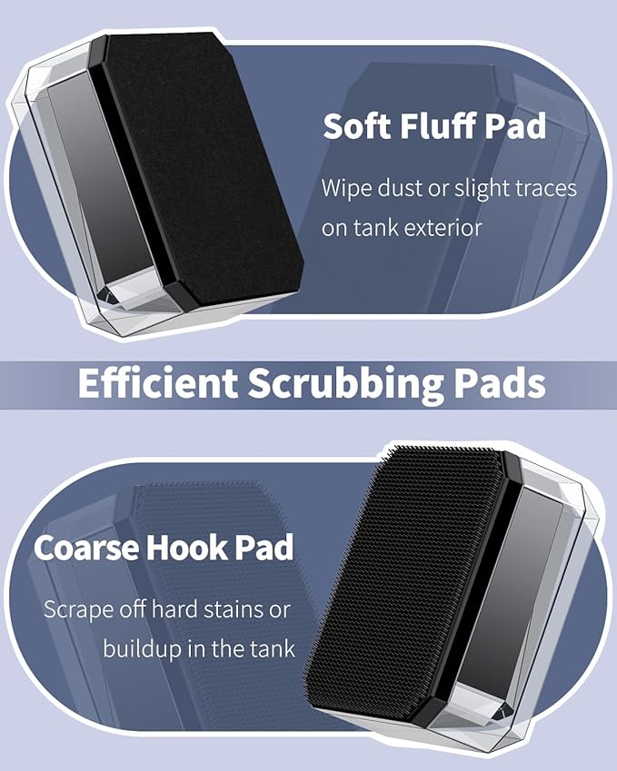 - Double-sided Cleaning: The coarse pad effectively removes tough stains or buildup in the tank without scratching the glass. And the soft fluff pad wipes away any water spots or dust on the tank exterior. Thoroughly polish your aquarium to be crystal clear