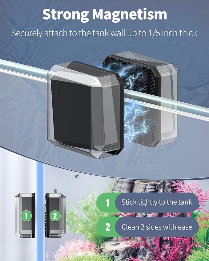 - Strong Magnetism: The magnetic aquarium glass cleaner always securely attaches to the tank wall up to 1/5 inch thick. No risk of falling off! Make sure the magnet is clean before using it in your aquarium