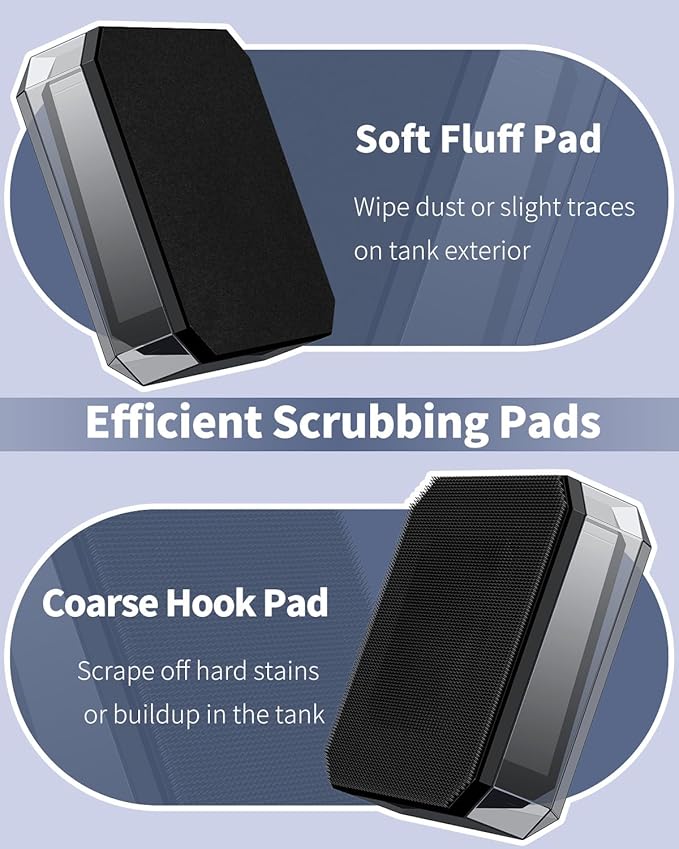 - Double-sided Cleaning: The coarse pad effectively removes tough stains or buildup in the tank without scratching the glass. And the soft fluff pad wipes away any water spots or dust on the tank exterior. Thoroughly polish your aquarium to be crystal clear