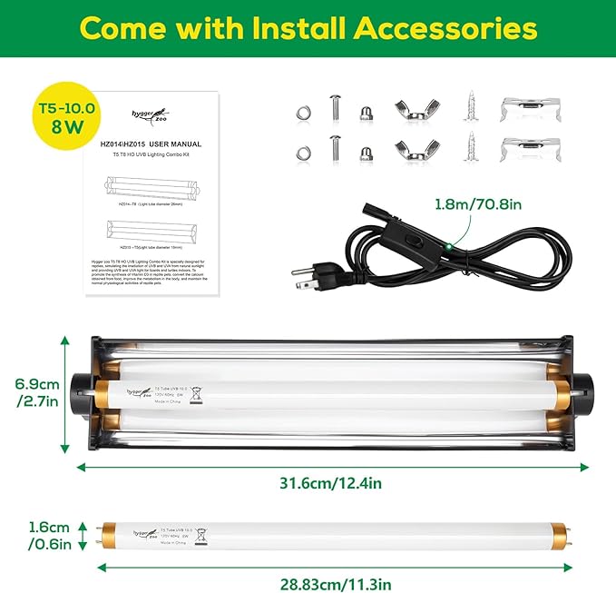 - 🌞🌞Higher UVB Output Value. T5 10.0 8W UVB reptile light fixture is 12 inch. Higher UVB output promote reptiles’ vitamin D3 synthesis and help them grow better. And the reptile UVB light also can help promote the absorption of their calcium and phosphorus, improve their reproductive behavior and boost their immunity.