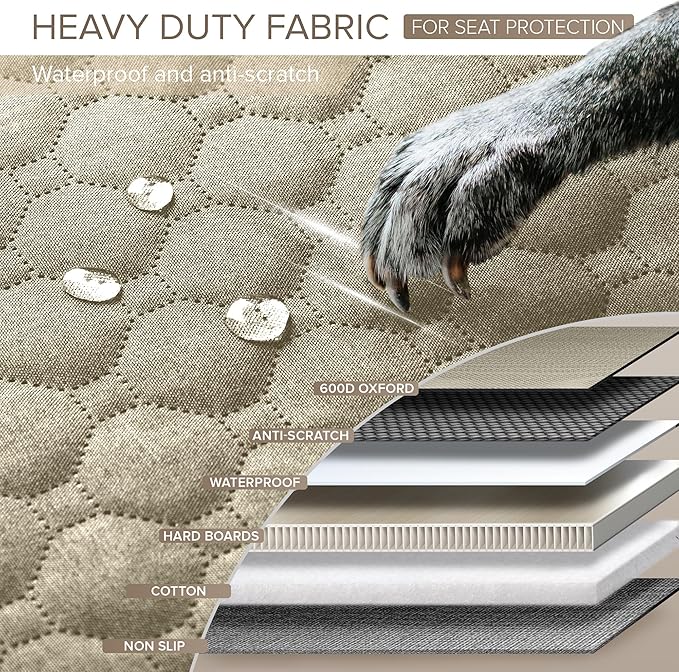 - HEAVY DUTY DOG CAR BED TO ALL-ROUND PROTECTION - The waterproof back seat cover made of 6-layer fabrics, including strong 600D Oxford, dog car seat cover hard bottom and special fabric for scratch-resistant, safeguarding car seats from wear, water and stains. Backseat cover for dogs in car with extra higher door protector avoid doors from scratches and damage. Let dogs hop in and out the dog hammock bed with joy, while car seat covers for dogs takes care of preserving your car perfectly