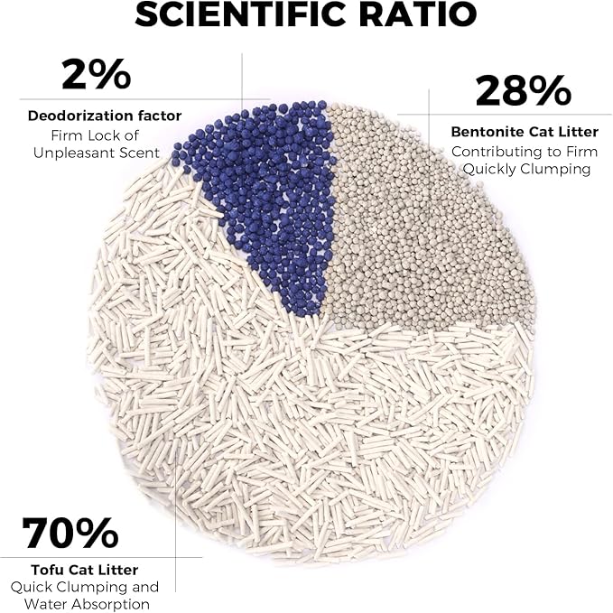 - Unique Mixed Formula: It combines the advantages of tofu cat litter and bentonite cat litter. The tofu cat litter is deodorizes well and can be flushed down the toilet. The bentonite cat litter forms firm clumps, creating a comfortable and clean toilet environment for cats