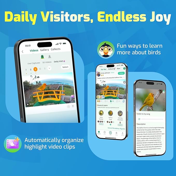 - HD Day & Night Viewing: Equipped with a 3MP HD camera, motion sensor, and 140° wide-angle lens, the bird feeder captures crisp footage in 1 second and supports night vision. Connects via 2.4GHz Wi-Fi and sends real-time alerts to your device for vivid, round-the-clock viewing