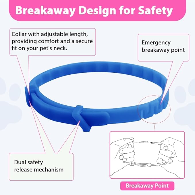 - Unique Dual Safety Release Mechanism & Emergency Breaks Away Point: This cat flea collar is equipped with a dual safety release mechanism and an emergency breaks away point, ensuring maximum safety for your pet. Even during active play or outdoor adventures, the collar stays securely in place, providing continuous protection. If your cat gets caught or pulls on the collar, it will safely break away to prevent injury, giving you peace of mind knowing your pet is safe.
