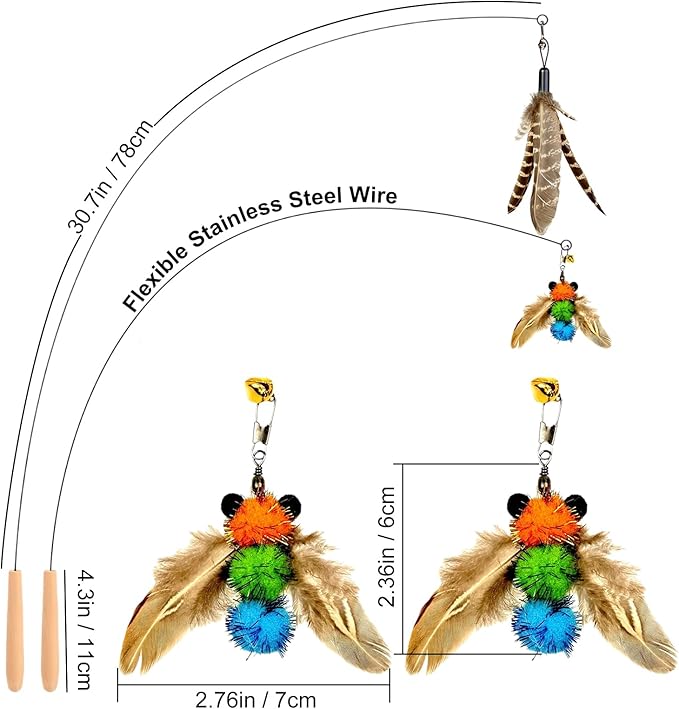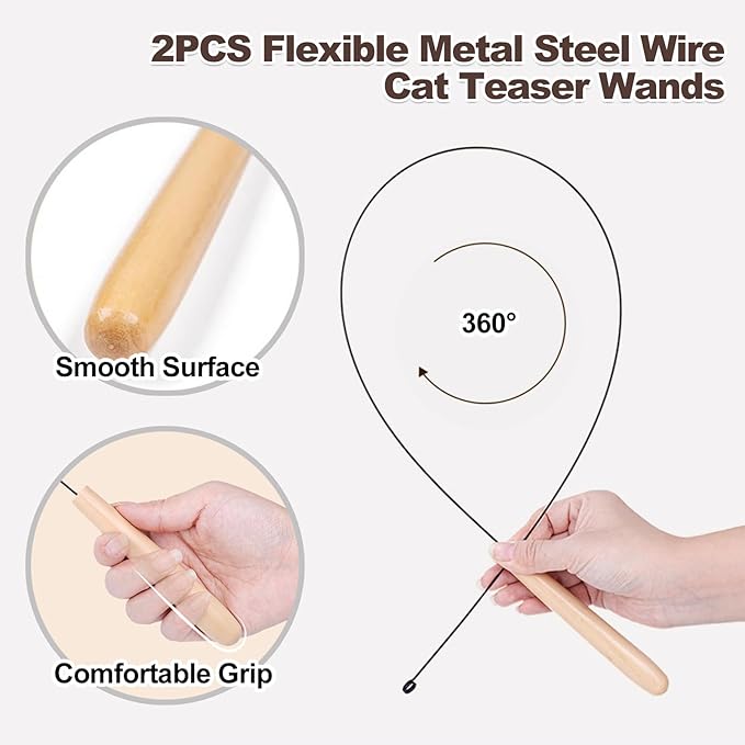 - 【Two Flexible Steel Wire Cat Teaser Wands】The cat toy wands are made of elastic stainless steel with a natural wooden handle, this will be more sturdy and comfortable for use, total length is 35 in. The steel wire has excellent elasticity and is easy to control, it will make the feathers move more flexibly and with greater amplitude, which can make it more fun for the cat to "hunt".