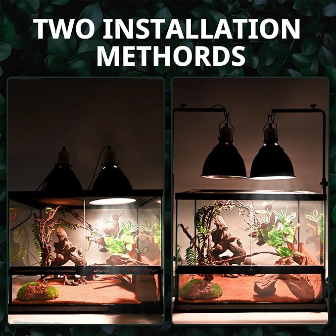 - 【Package Include】: This reptile light fixture is sold in 2pcs and comes with 2 hooks for free. It is convenient for you to hang on the floor lamp stand or directly place the lamp fixture on the screen of reptile glass terrarium or lizard breeding box. 2 independent switches power cables could easy control individual lights.