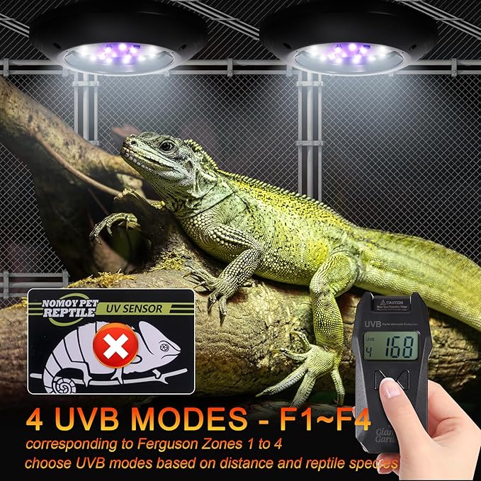 - Adjustable UV: Our reptile UVB light is equipped with an adjustable UV function, with settings from F1 to F4 corresponding to Ferguson Zones 1 through 4. Whether you have desert species or forest species, it provides optimal UV exposure to ensure your pet’s healthy growth. UVB helps reptiles synthesize vitamin D3, promoting calcium absorption and supporting healthy bone development. The fixture does not emit harmful UVC