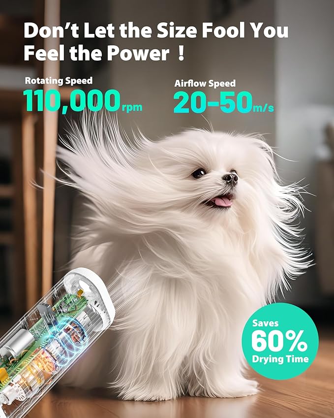 - Fast Drying with Powerful Airflow: No more long drying sessions! With a high-speed 110,000 RPM motor and 50m/s wind speed, this 950W dog dryer cuts drying time by up to 60%, making grooming faster and easier. Whether after a bath or outdoor adventures, your pet stays comfortable while you save time and effort.