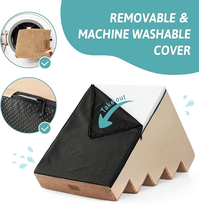 - Non-Slip Base and Removable Cover: Our dog steps for beds are equipped with a non-slip base featuring rubber dots for additional grip, minimizing movement during use. The pet steps cover is waterproof on the inner side, so you don’t have to worry about stains seeping into the foam. The outer cover is removable and machine washable for easy cleaning