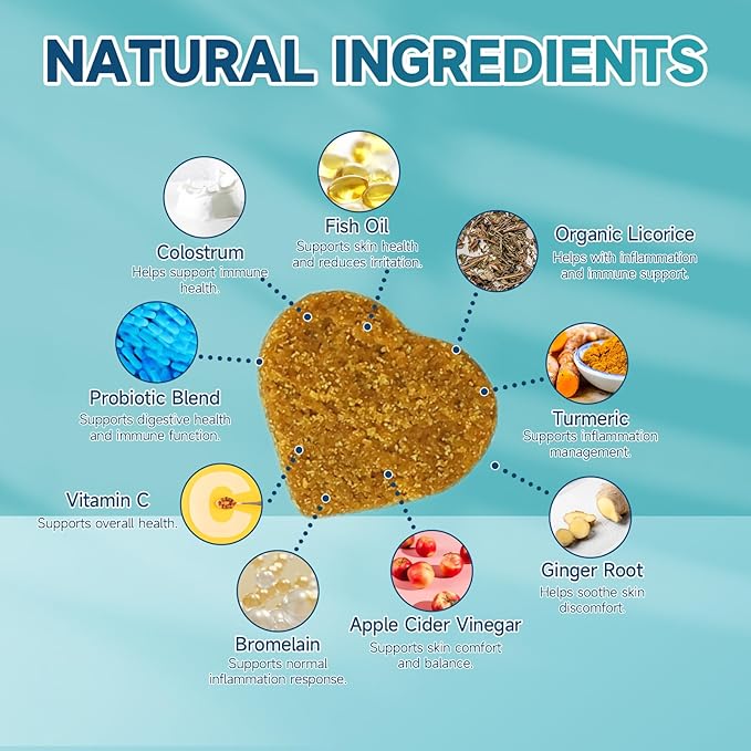 - Skin, Coat & Immune Support: Packed with beneficial ingredients like Omega-3 fish oil, colostrum, probiotics, and enriched with Vitamin C and E, our chews support healthy skin, a shiny coat, and a strong immune system. These chews provide effective itch relief for dogs while boosting your dog’s overall wellness.