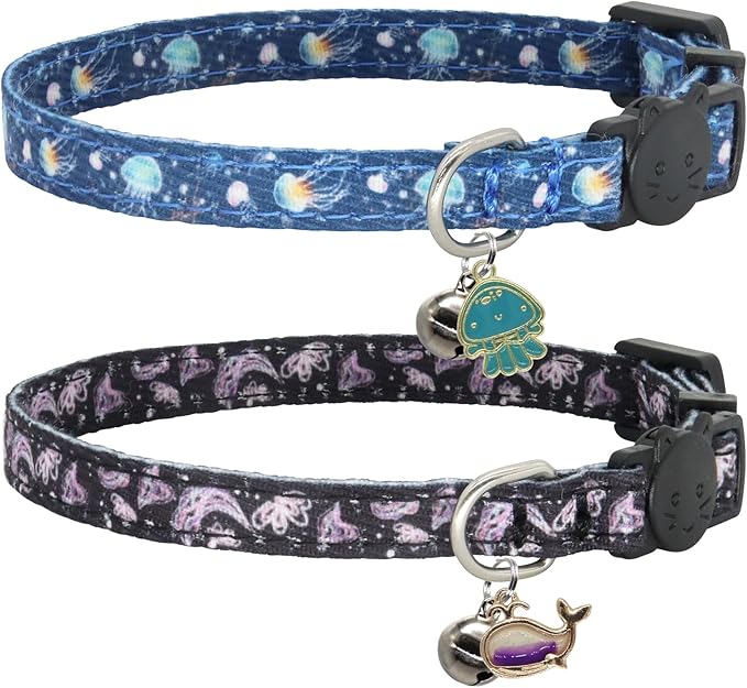 Cat Collar Breakaway, 2 Pack Cotton Cats Collars with Bells, Cute Ocean Shaped for Girl Boy Kittens