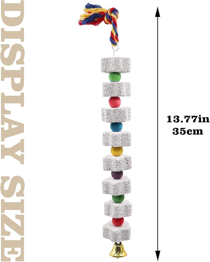 - Attractive and Functional Design: The star-shaped design is both visually appealing and practical for chewing. Colorful beads between the stones grab your parrot's attention, and the bell at the bottom emits a pleasant sound with each peck, adding extra fun for your pet.