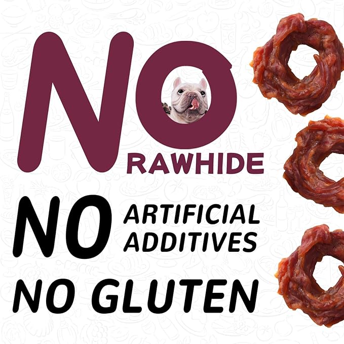 - Taurine Added: Infused with taurine, these duck jerky Rings support heart health and cognitive function. They help protect your dog’s retina and encourage optimal brain development, making your furry friend more lively and energetic.