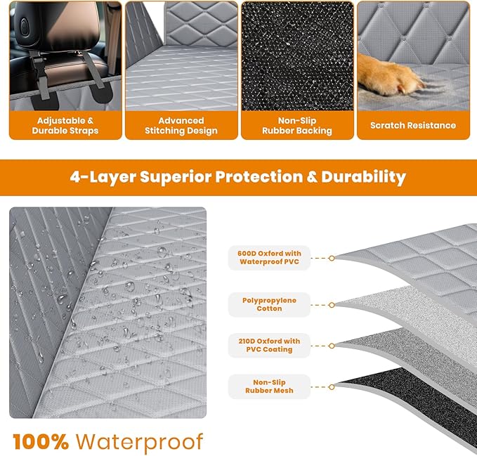 - 【Safe & Odor-Free】 Don't worry about unpleasant odors! Our dog car cover is made of advanced materials, ensuring it is safe for both humans and pets. The 4-layer backseat cover for dogs in car protect your vehicle from scratches, so you can enjoy every trip to the fullest