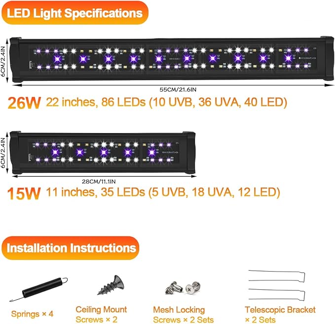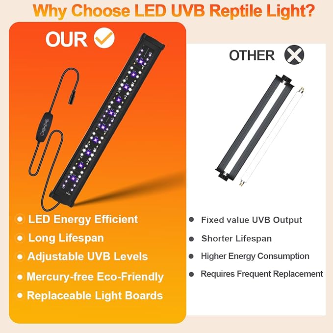 - High Output UVB Light for Reptile Health - Transform your reptile’s environment with our LED UVB Reptile Light (22 inches, 26W). This powerful light provides adjustable UVB levels from 10.0 to 20.0, ensuring optimal UVB exposure. UVB light is crucial for reptiles as it stimulates appetite, promotes Vitamin D3 synthesis, and helps with calcium absorption—key for healthy bones and overall well-being. Perfect for bearded dragons, turtles, and other UVB-dependent reptiles.