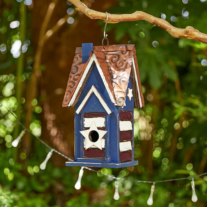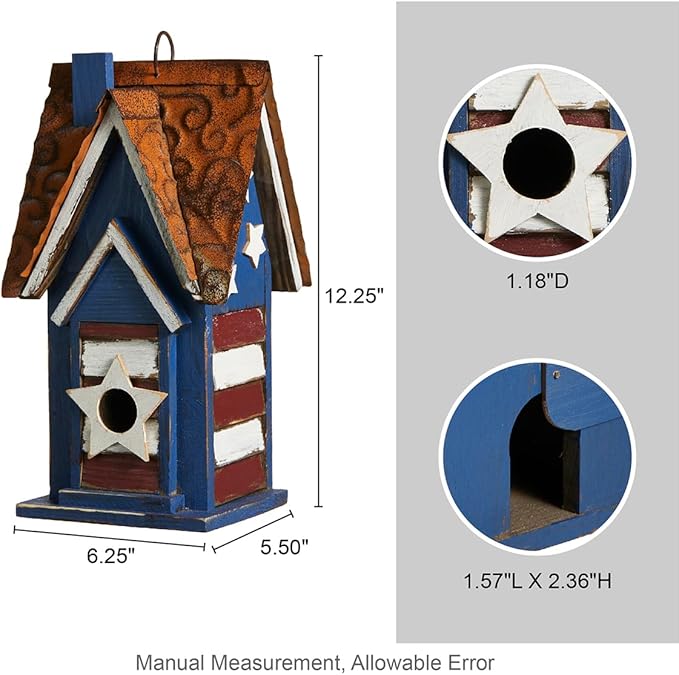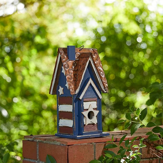 - 【Decorative Birdhouses for Outdoors】Wood garden birdhouse decor is hand painted with distressed look. Birdhouse is inspired by the American flag, making it a standout addition to any outdoor space..Attract wild bird like wrens and chickadees to your garden or backyard with this whimsical birdhouse for outside display.
