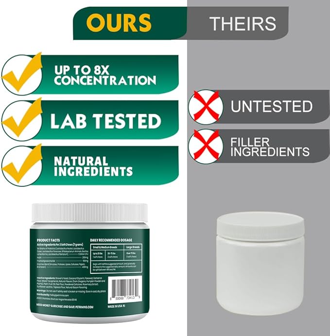 - Advanced Allergy & Digestive Support for Dogs or Cats: PetriMins Pet Probiotic Chews are expertly formulated to provide comprehensive relief from itchy skin, paw licking, and digestive discomfort caused by food or environmental sensitivities. Our canine chews combine a potent blend of probiotics, prebiotics, enzymes, and pumpkin fiber to promote optimal gut health and enhance your dog's immune system.