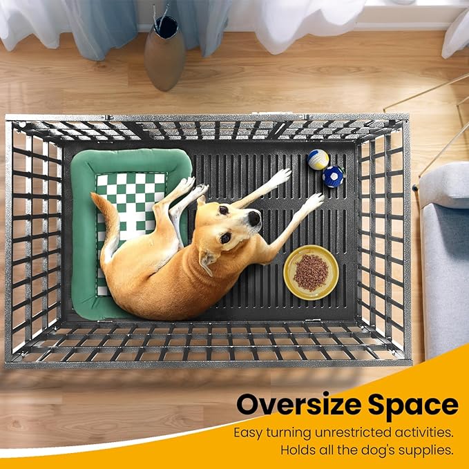 - Effortless Assembly & Quick-Clean Design:Most of the dog crate parts were pre-assembled, you just need to fit it with four wheels and six (it used to be ten) screw bolts, only takes within 5 minutes to complete. The two removable bottom pallets (a washable high grade plastic pallet and a upgrade metal pallet), make clean up more conveniently.Dog parenting can be challenging, but this crate turns those struggles into stress-free moments - your ultimate partner in creating paw-friendly routines.