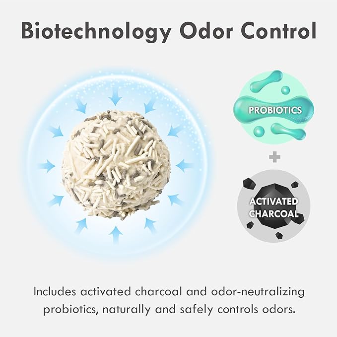 - ADVANCED ODOR CONTROL AND WATER SOLUBILITY: Experience advanced odor control with our exclusive probiotic and activated carbon formula, ensuring a fresh and pleasant atmosphere for both you and your feline companion. Plus, our cat litter is crafted from food-grade ingredients, offering an environmentally friendly and biodegradable solution. It even dissolves quickly in water, making cleanup a breeze.