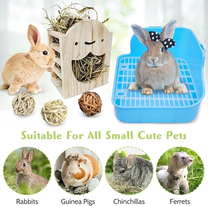 - COMPLETE STARTER KIT for SMALL PETS:Package includes 1 rabbit litter box, 1 wooden hay feeder, 3 interactive balls, and 1 mini broom & dustpan set. Perfectly meets daily feeding, playtime, and cleanup needs for rabbits, guinea pigs, ferrets, and other small animals