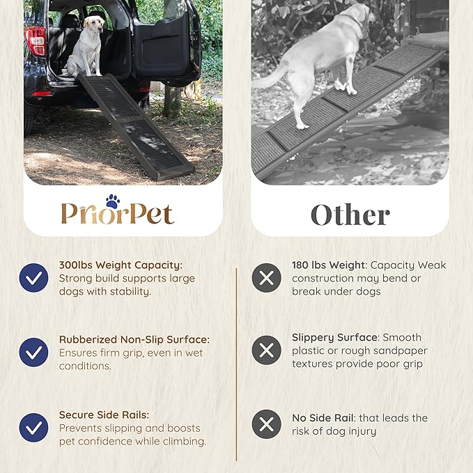 - RUBBER ANTI-SLIP SURFACE – SAFE EVEN WHEN WET: Premium rubber surface provides secure, paw-friendly grip—wet or dry. Rubber feet on both ends prevent sliding on ground or vehicle. Ideal for large or senior dogs.