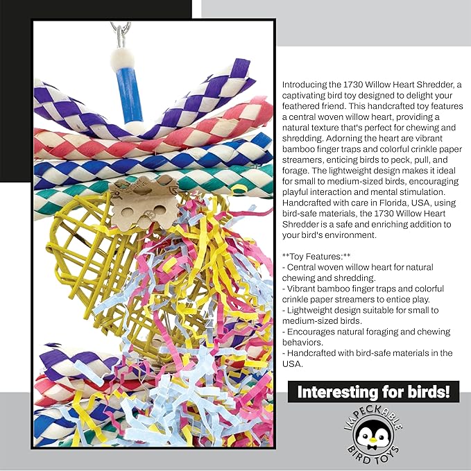 - - 1730 Willow Heart Shredder features a woven willow heart, bamboo finger traps and bright crinkle paper for shredding fun. This toy stands out in any aviary with its explosions of crinkle paper.