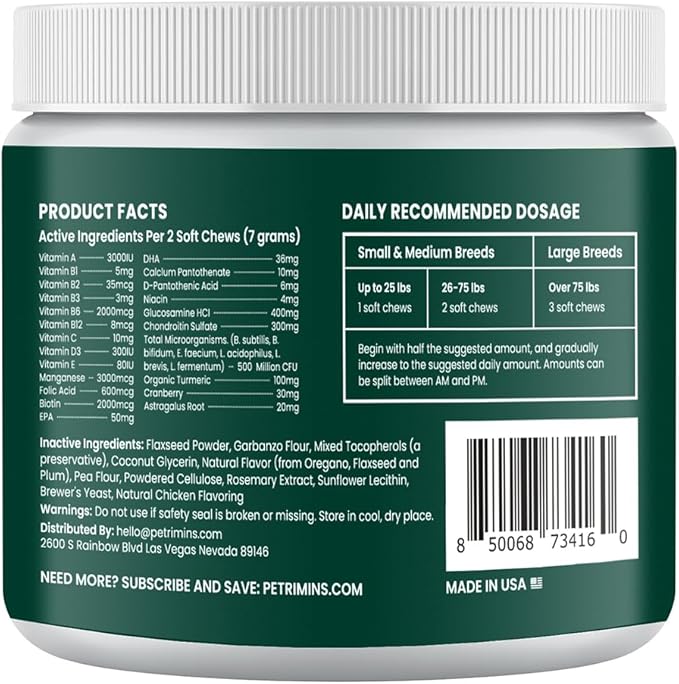 - Hip & Joint Friendly - Each dog vitamin chew is formulated with Glucosamine HCI and Chondroitin Sulfate to promote joint health and mobility. The dog chew also contains organic turmeric to help reduce inflammation and relieve joint discomfort after exercise, designed to account for both daily exercise and the needs of senior dogs.