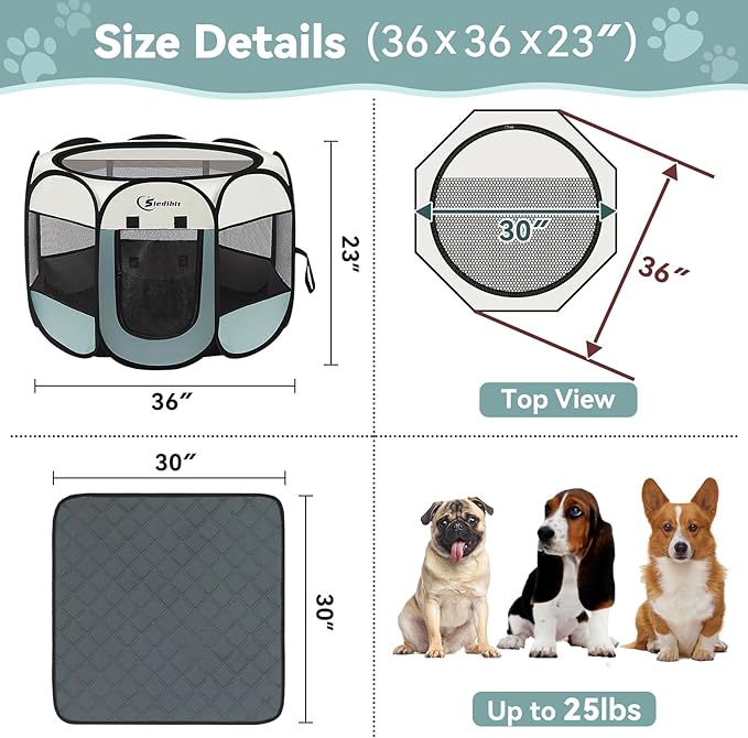 - 【No Assembly required】Opening the dog pen takes only a few seconds, is lightweight, strong, and does not require assembly. When not in use, it can be folded into the tote bag provided by us, which takes up minimal space and is easy to carry and store. Spacious interior Spaces allow your pet to play, sleep, hide or isolate. Perfect for indoors, lawns, beaches, parks, Tours, camping and more!