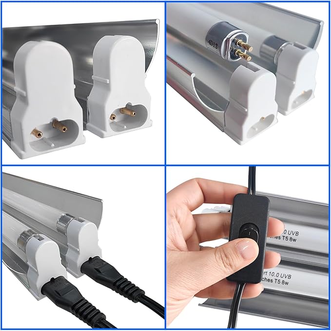 - 【UVB 10.0 T5 Tube】The UVB reptile light fixture comes with 2pcs 8 watt T5 fluorescent tube, 10% UVB output can ensure that your reptiles are in a healthy state, It can help the absorption and utilization of vitamin D3 and calcium by reptiles, and preventing bone diseases