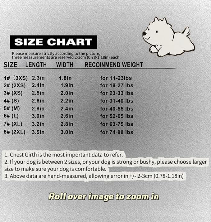 - Size: Length Width Recoinmend weight 1#2.3in 1.8in for 11-23lbs ; 2#2.4in 1.9in for 18-27lbs ;3#2.5in 2.0in for 23-33lbs ;4#2.6in 2.2in for 31-40lbs ;5#2.8in 2.4in for 40-55lbs ;6#3.0in 2.6in for 52-65lbs ;7#3.2in 2.8in for 63-75lbs ; 8#3.5in 3.0in for 74-88lbs