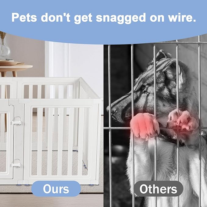 - DIY ASSEMBLY FEATURE:Our dog playpen can be assembled into square and rectangular shapes as you wish.The modular design lets you say goodbye to additional screws and bolts,thus no other tools are needed for installation.Each piece of fence is connected with plastic attachments which are also included in the product package,you can finish the whole assembly in 10-20 minutes,even faster for disassembly,add this delight to your room for now!