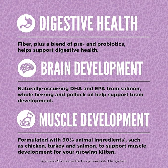 - This nourishing cat food kibble helps support your kitten’s Digestive Health, Brain Health and Muscle Development.