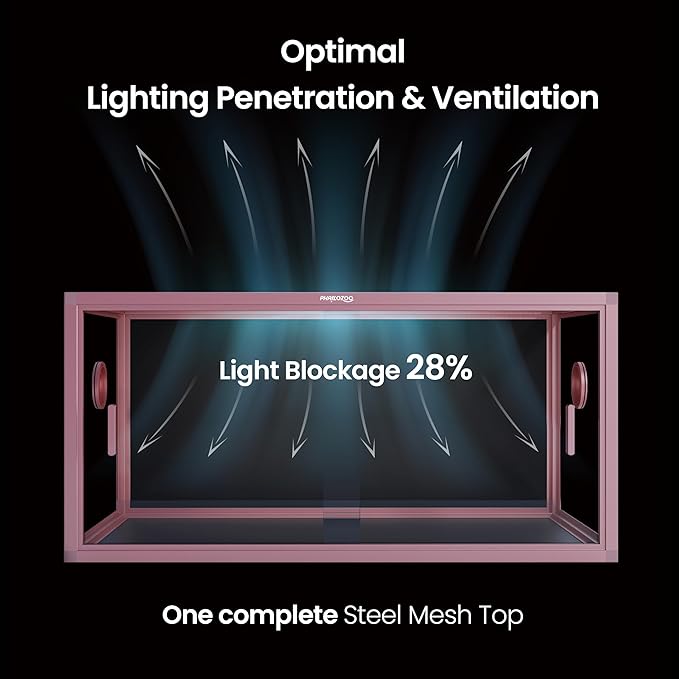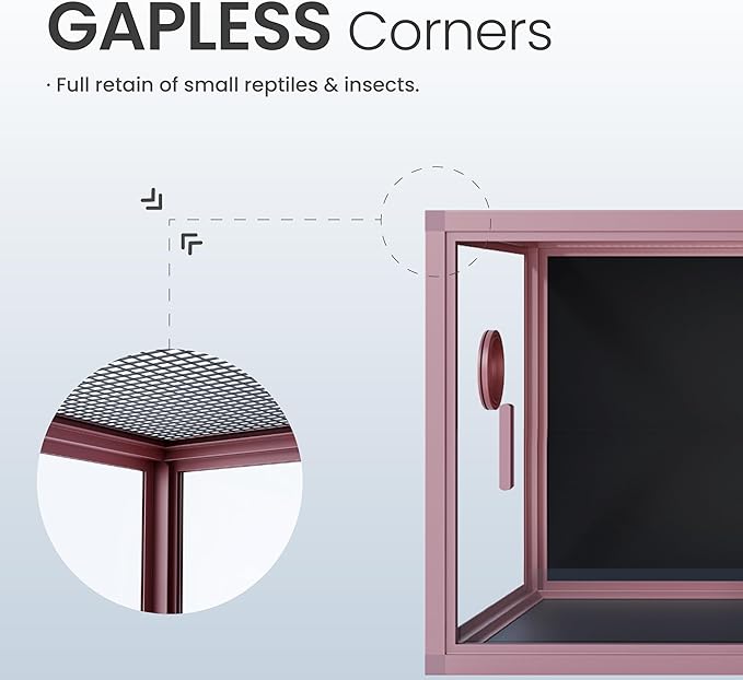- 【Worry Less】NO GAPS FOR ESCAPING with fully closed structure. Rigid tempered glass doors with tiny door gaps. Rust proof top screen ventilation allows better air circulation, and optimal lighting penetration.