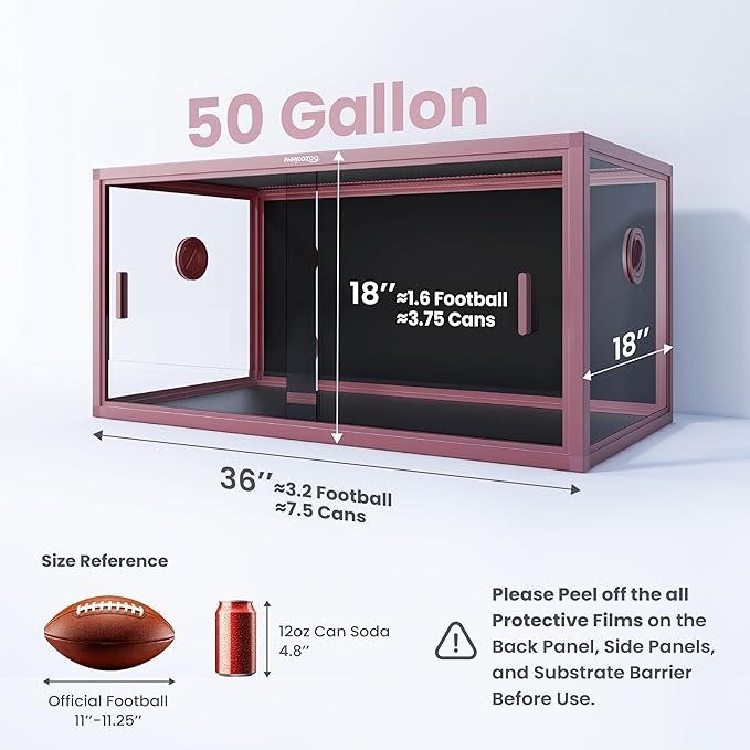 - 【Size Matters】Phailozoo 50 gallon reptile tank measures 36''Lx18''Wx18''H, perfect for desert and rainforest bioactive setup, such as bearded dragon tank, snake tank, and lizard tank. Spacious playground for your beloved reptiles to explore and thrive while being safe.