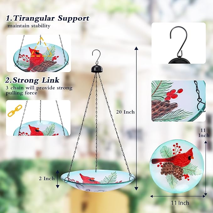 - {Cardinal Hanging Bird Bath} Birds will nourish the soil and making your garden into a bird sanctuary. This hanging bird bath has clear, bright light green plates, and the cardinal stood on the pine tree which would attract more birds to bathe, and garden lovers will delight in this bird bath
