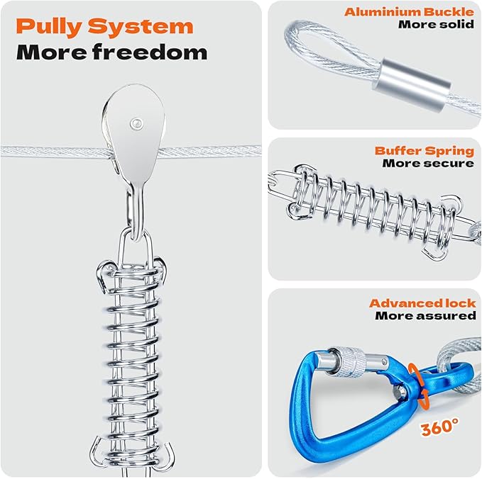 - Tangle-Free 50FT Dog Run CableSmooth-gliding pulley moves effortlessly along thick 5mm steel cable (vinyL-coated for weather resistance),creating a 3,000+sq.ft safe zone-3Xlarger than standard dog stakes for outside