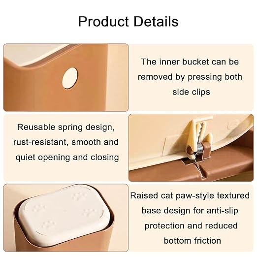 - Hidden Garbage Bag Design:Double-layer inner and outer bucket design with side clips to securely fix the buckets together.Garbage bags are hidden between the two buckets, preventing pets from scratching or biting them.Easy to remove the inner bucket by pressing the clips with both hands.
