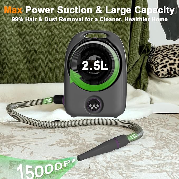 - 2.5L Canister for Pet Hair Vacuum Groomer: Featuring a spacious, detachable 2.5L canister, our pet grooming vacuum minimizes interruptions during grooming sessions. You won't need to stop and empty dog grooming vacuum for shedding frequently, allowing for longer, uninterrupted grooming times