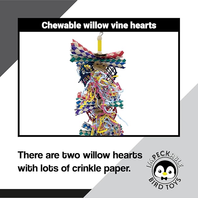 - * 1042 Duo Willow Heart Shredder features two stacked willow hearts layered with bamboo finger traps and colorful crinkle paper, designed for birds that enjoy pulling, shredding, and textured play.