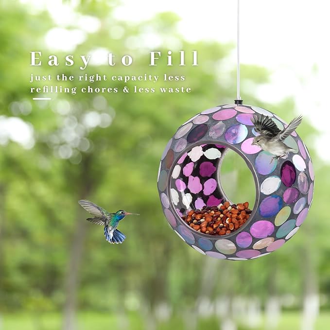 VCUTEKA Mosaic Bird Feeder, Round Glass Container Hanging Bird Feeders for Gardens, Yards, Decks to Attract Wild Birds, 7-Inch Purple