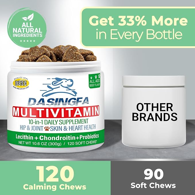 10-in-1 Dog Multivitamin Supplement, Calming Chews with Chondroitin & Probiotics, Mega Pack 10.6oz/300g (120 Chews), Supports Joint Health & Calming, Beef Flavor