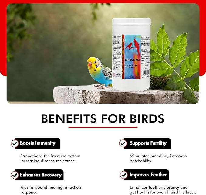 Morning Bird Spirulina, Supplement for Caged Birds, Organic Bird Food Supplement with Vitamins, Proteins, and Amino Acids for Parakeets, Cockatiels, Budgies, Finches, Canaries, and Parrots, 16 oz