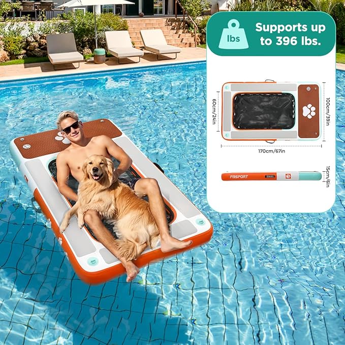 - High Quality & Safety: Our inflatable dog pool float is constructed with thickened, tear-resistant EVA material and heavy-duty nylon fabric, supporting up to 396 pounds for worry-free fun. It comes with a non-slip grip pad on the front and non-slip eva pads and anti-scratch material all around to ensuring your dog stays secure. Whether your pet is a playful splasher or a laid-back lounger, this inflatable dog float is designed to keep them entertained and comfortable all day long.