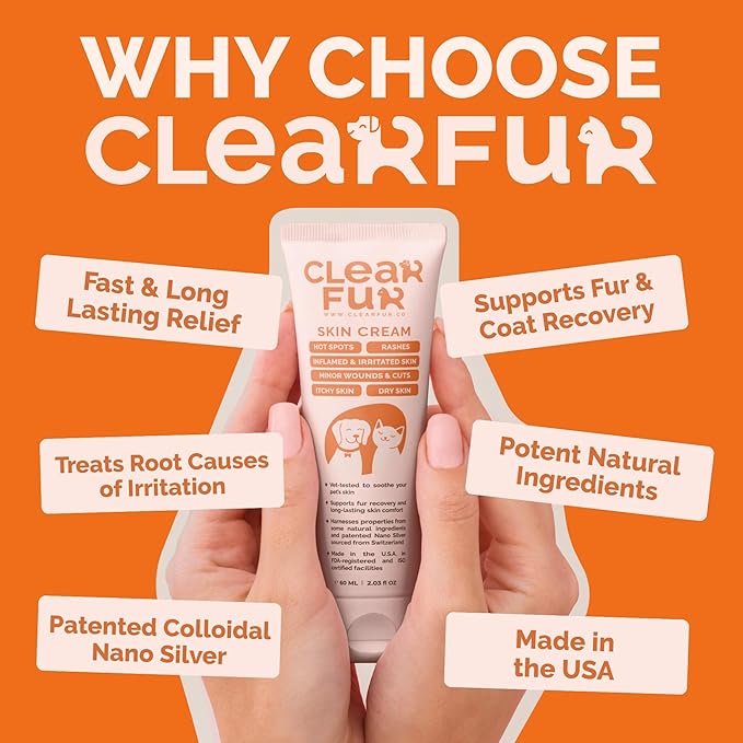 - FAST-ACTING RELIEF WHILE TREATING THE SOURCE: Experience immediate relief for your pet’s irritated skin with ClearFur Skin Cream. Our advanced formula swiftly soothes hot spots, itchy and inflamed skin, rashes, flaky patches, burns, bug bites, sores, minor wounds, and cuts. The fast-acting properties of ClearFur Skin Cream not only alleviates biting and scratching but also ensures a rapid recovery with its lick-resistant, non-toxic ingredients. More than just a quick fix, ClearFur Skin Cream addresses the root causes of skin irritation, promoting comprehensive healing and restoring your pet's skin to its healthiest state.